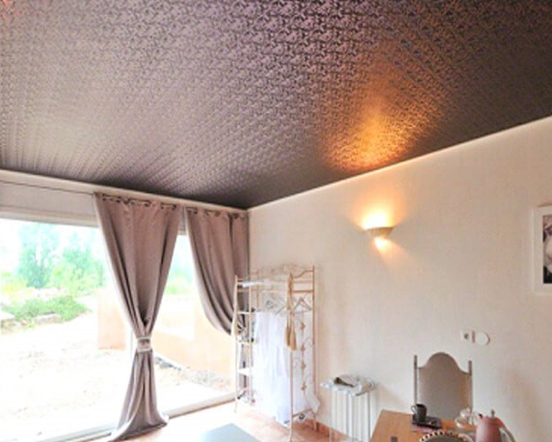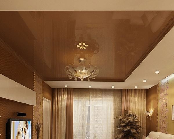 Коричневые натяжные потолки могут успешно скрыть некоторые недостатки старых потолочных покрытий, такие как трещины или неровности.