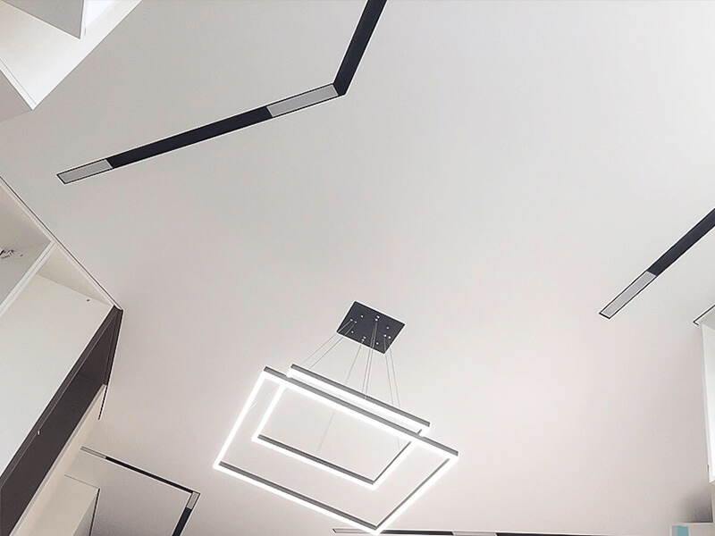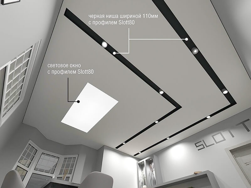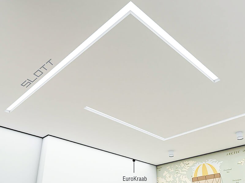 В основе линейного освещения натяжного потолка лежит алюминиевый профиль SLOTT с демпферной системой, бесщелевым примыканием. Используется как для подсветки с открытым светом без рассеивателя, так и с рассеивателем. Решает задачи, которые трудно осуществимы с потолками из гипсокартона.
